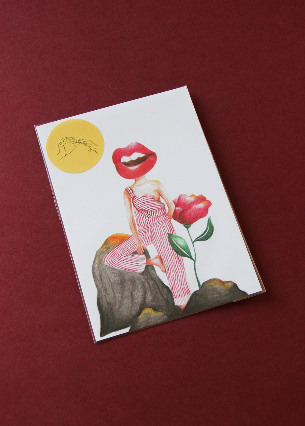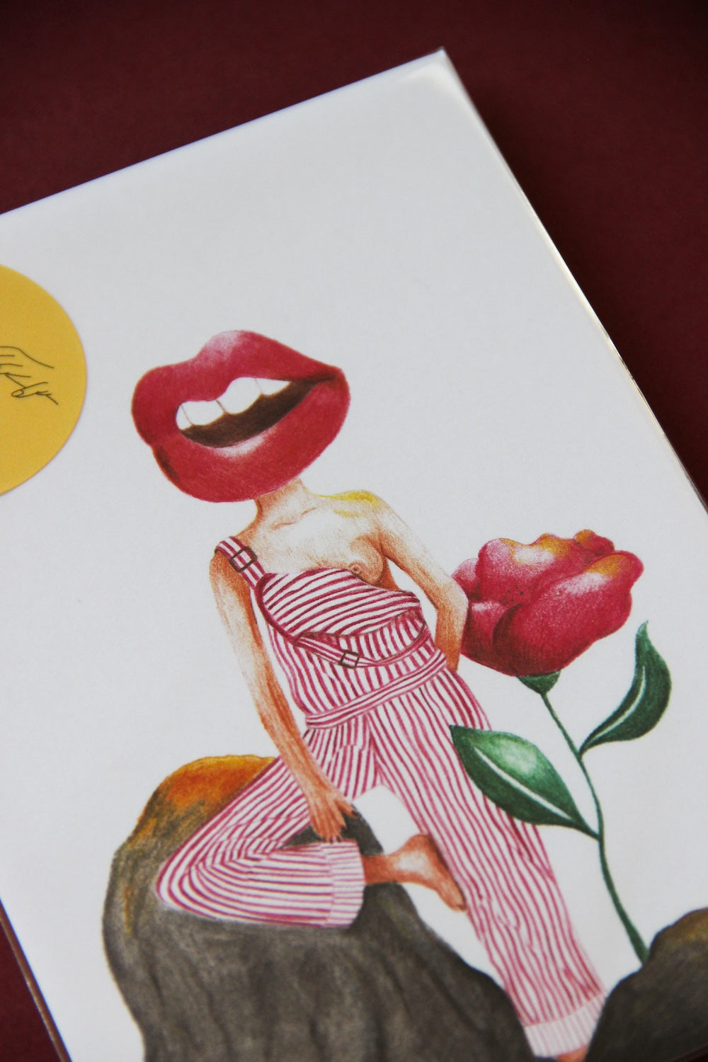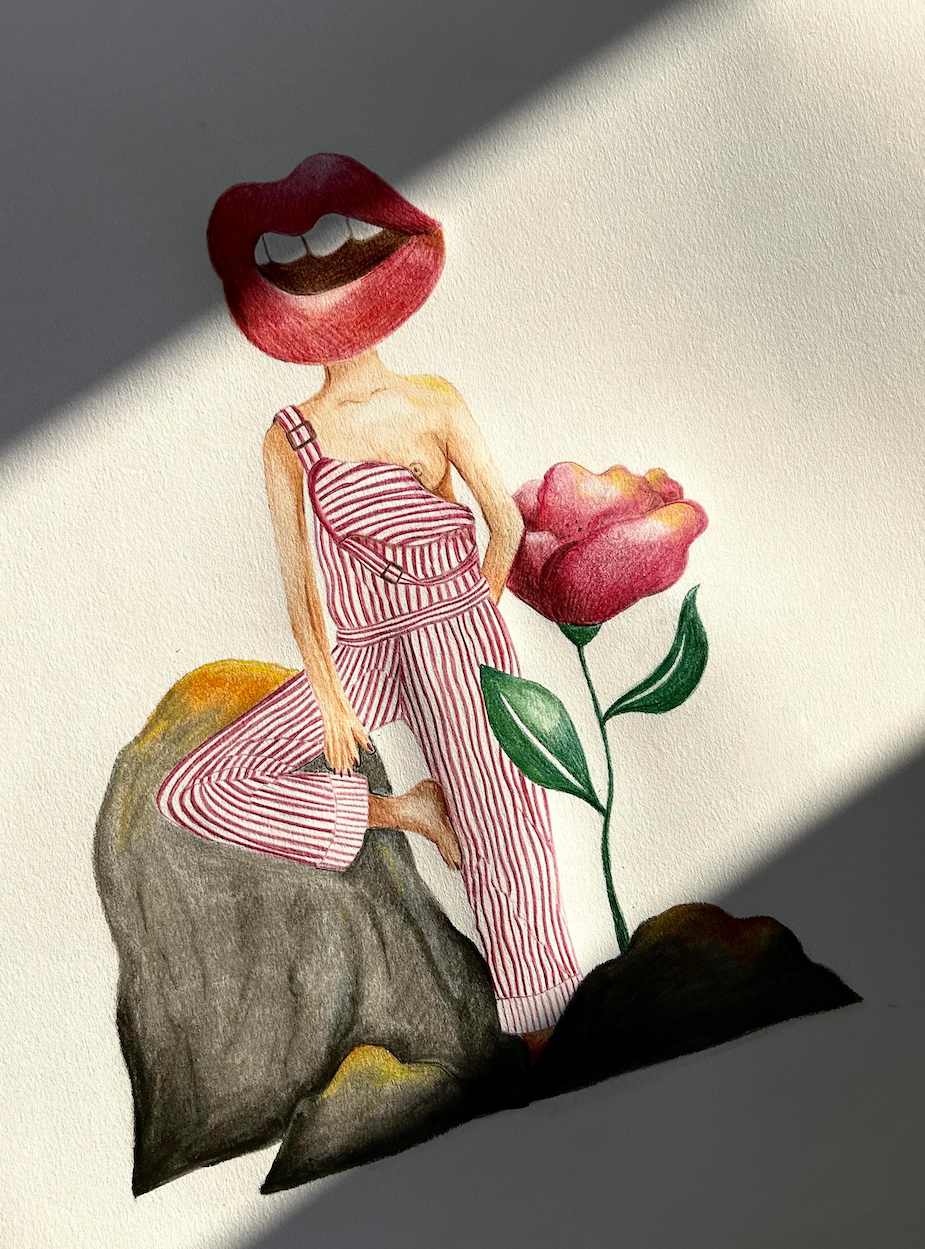 Dans "La Salopette", une femme se tient debout dans un décor minéral évoquant les rivages qui bordent la mer ou les paysages rocailleux des montagnes. Le regard du spectateur est naturellement attiré par le sein dévoilé par la bretelle tombante de sa salopette. Dans cette oeuvre, je vous invite dans un univers délicieusement érotique. Ainsi, le rouge, représenté par cette bouche pulpeuse et par la rose en arrière plan, accentue la douceur et la tension qui émanent de la composition.