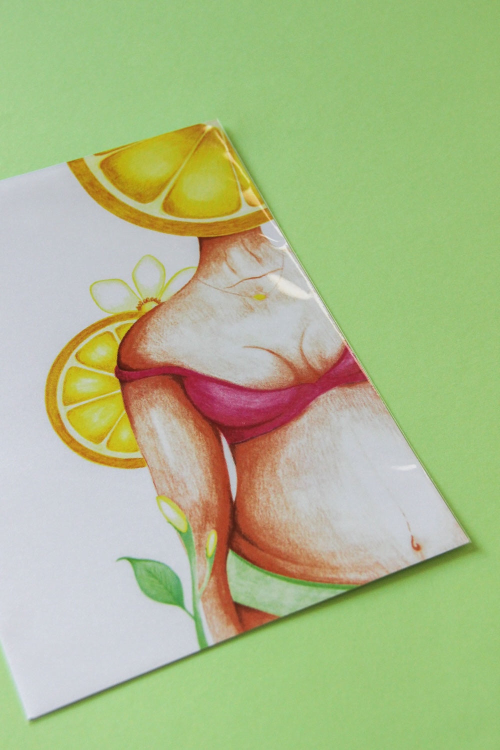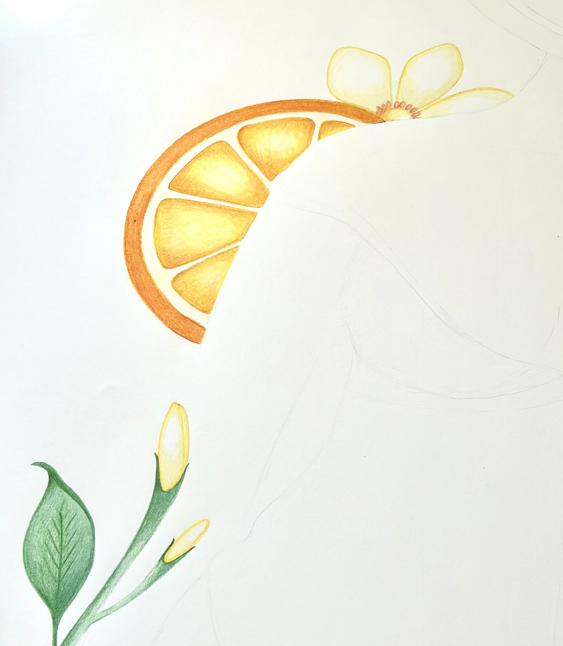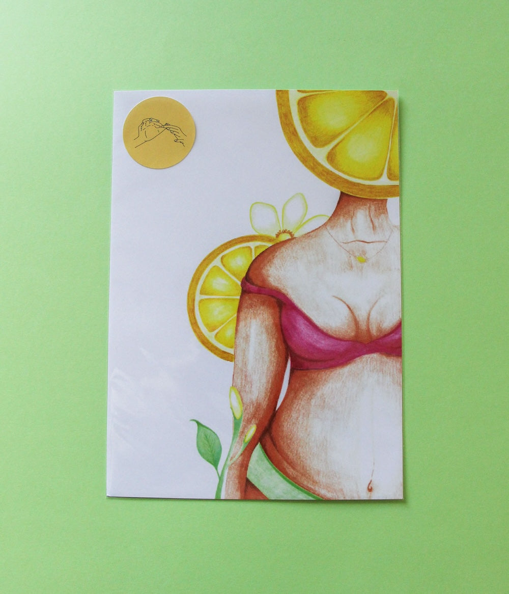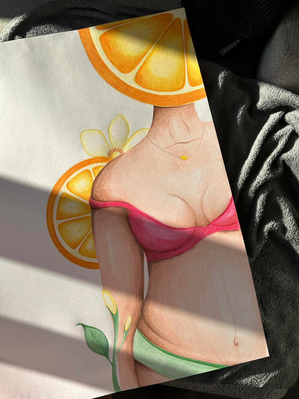 "Néroli" tient son nom de l'huile essentielle du même nom, produite à partir de la fleur de bigaradier (oranger de Séville). Cette oeuvre, c'est la rencontre entre la douceur de la féminité et les agrumes solaires, pétillants. Le regard est attiré et suit les courbes, ainsi que les formes des agrumes, très ronds, puis il se pose sur un détail : le citron du collier, discret et frais !
