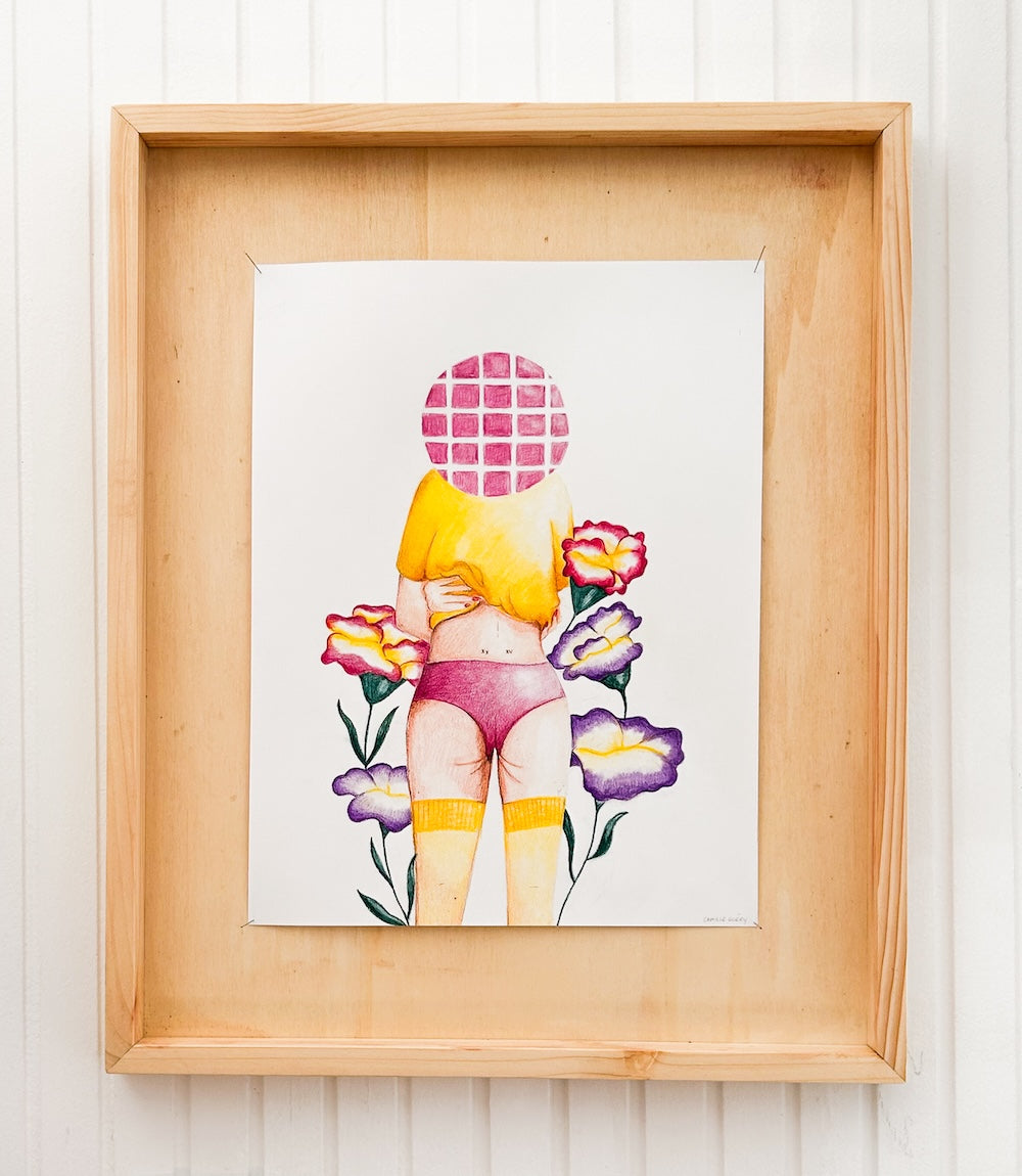 L'illustration est mise en valeur dans un cadre en sapin sans vitre (46 x 56 cm), fabriqué sur-mesure.